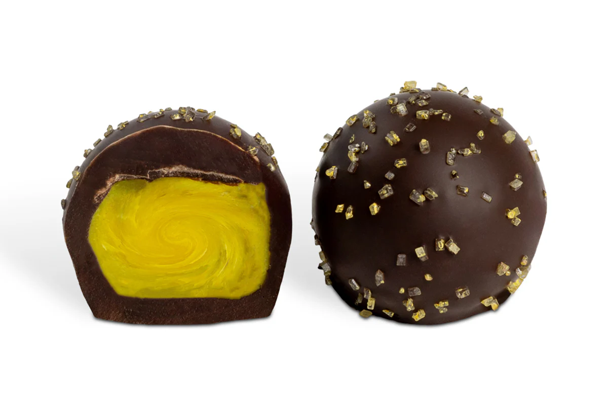 Tart lemon flavored ganache center in a dark chocolate shell, topped with yellow sugar crystals