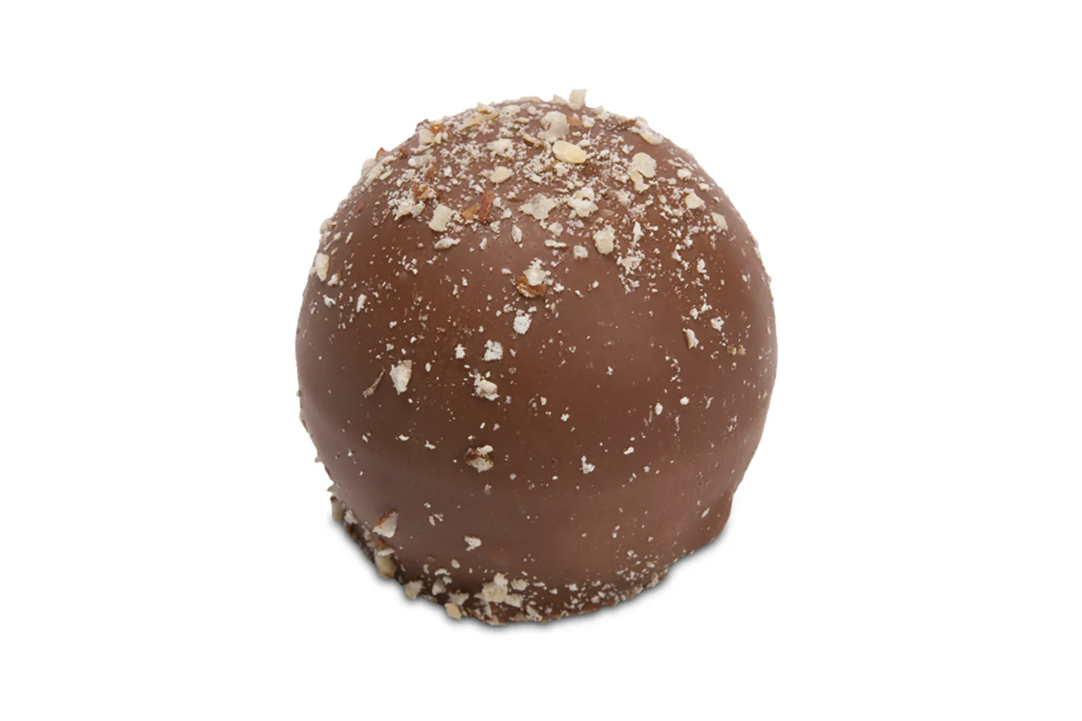 Hazelnut flavored ganache center in a milk chocolate shell, topped with ground hazelnuts