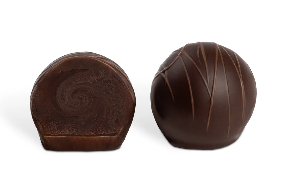 Espresso flavored ganache center in a dark chocolate shell with milk chocolate drizzle